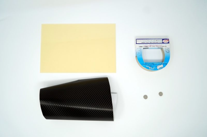 ラッピングシートはこういう奴です。Amazonで買うことも出来ますし、今はホームセンターやオートバックスなどのカーショップにも取り扱いが有ります。車をラッピングするなら上質な素材を使いたいところですが、今回は平坦な板に貼るだけなので、あまり素材にこだわる必要は有りません。